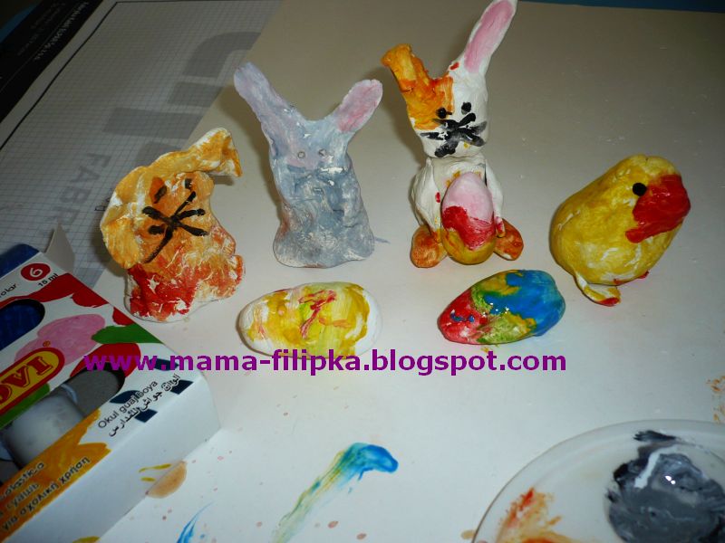 Następnego dnia, kiedy figurki zrobiły się całkiem twarde chłopcy zabrali się za malowanie. Bardzo spodobały nam się farby plakatowe Jovi, ponieważ mają bardzo żywe kolory i doskonale nadają się do malowania nie tylko po kartce, ale również po innych powierzchniach, w tym właśnie po glinie.